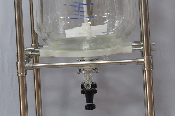釜底放料閥為玻璃和四氟材質,攪拌無集料死角,放料無殘留及腐蝕。